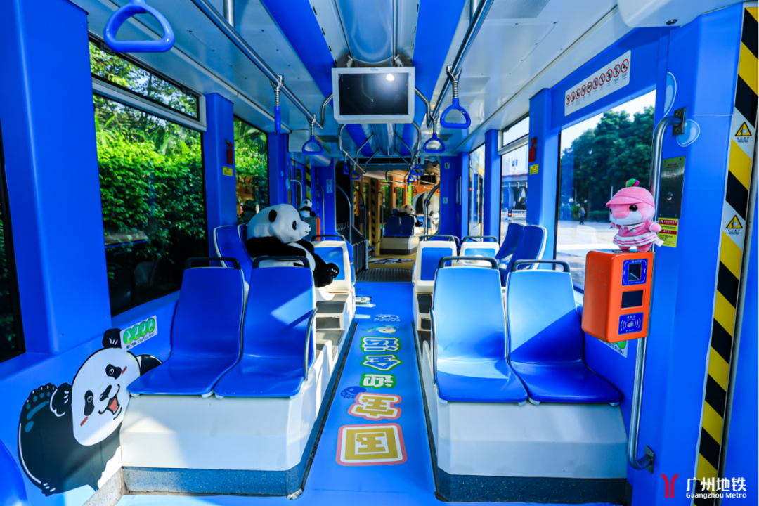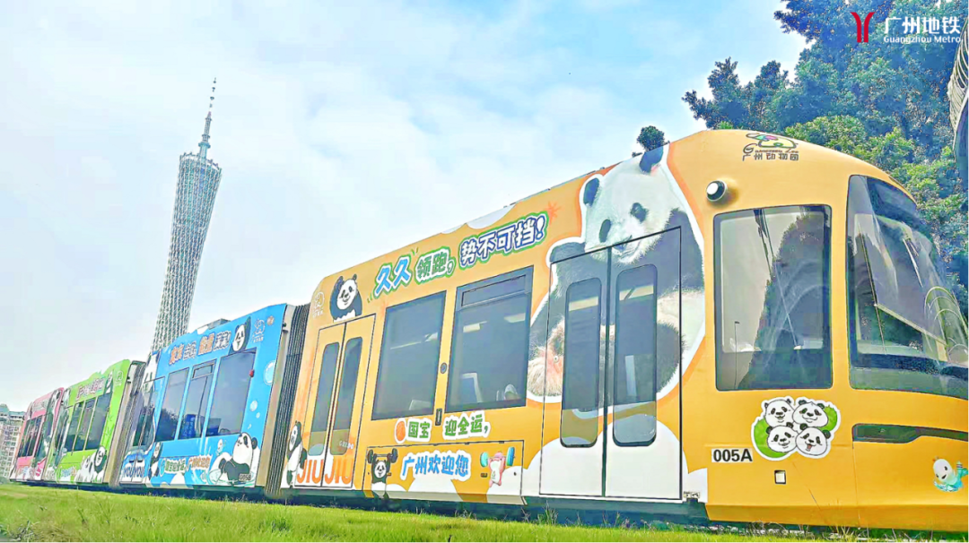 “广动号”主题有轨电车共四节车厢,采用黄、蓝、绿、粉等明快的“多巴胺”配色,将全运项目与熊猫特点巧妙融合,呈现广州动物园“星一”“雅一”和新成员“久久”“友友”4只大熊猫的独特个性。